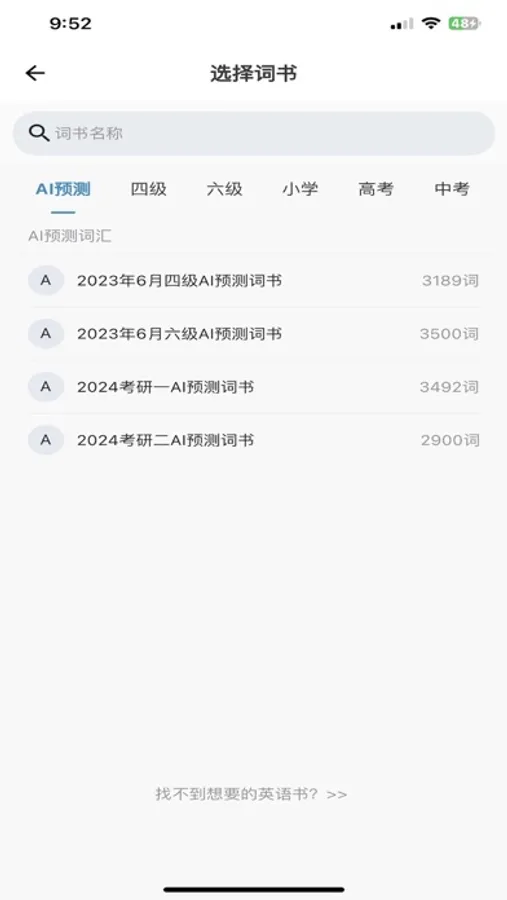 1: AI预测词书, 包括四六级,考研一,考研二最新的预测词书。