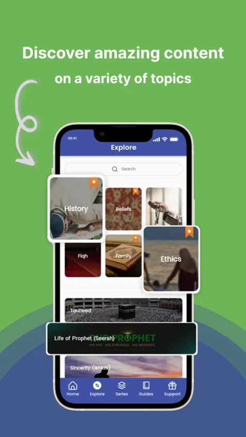 A Powerful Explore Tab: Find various content types organised into categories and subcategories for the first time on an Islamic learning app.