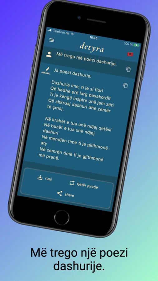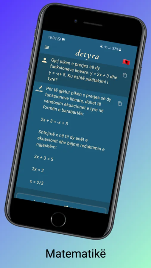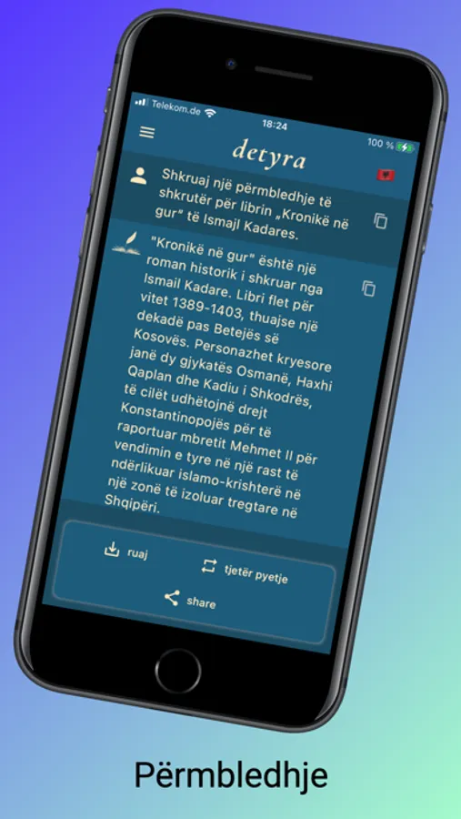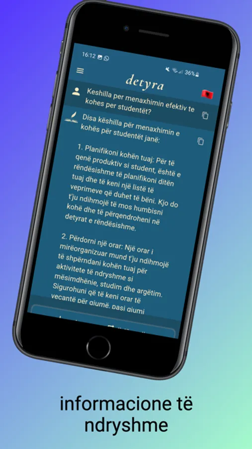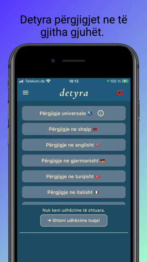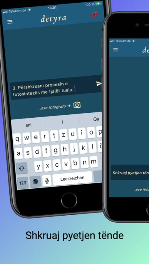 Welcome to detyra, the mobile app that helps students, learners, and everyone passionate about homework and other questions with artificial intelligence (OpenAI). Available on the App Store, 'detyra' was founded in March 2023 as a startup in Germany. Our goal is to adapt education in the Albanian-speaking region to the age of AI.