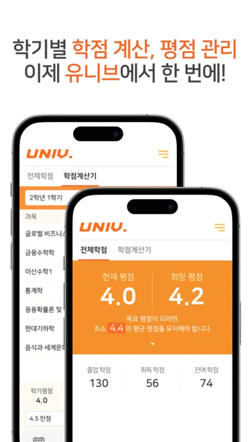 - 학교마다 다른 전체 평점을 기준으로 졸업 학점 & 현재 평점을 설정 ===> 앞으로 취득해야 할 유지 평점을 쉽게 계산!!
