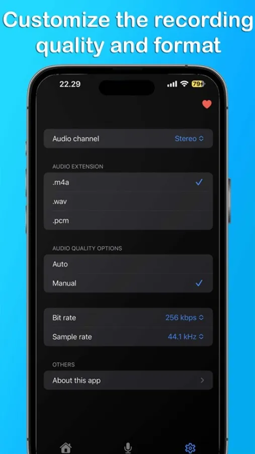 This application is an audio recorder for high-quality recording in M4A, WAV, or PCM format with a lot of customization.