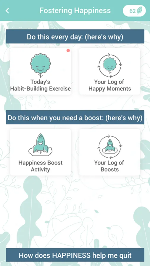 In this app, we ask you to work on your happiness. Each day, we ask you to complete a Habit-Building Exercise. Completing these exercises gets you in the habit of noticing the good things in your life, and lets you draw strength from them.