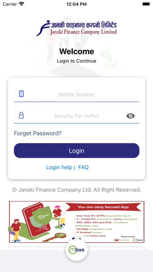 To be able to use this app, you first need to have a valid account maintained at Janaki Finance mBank, and you need to subscribe to the Janaki Finance mBank Banking Service.