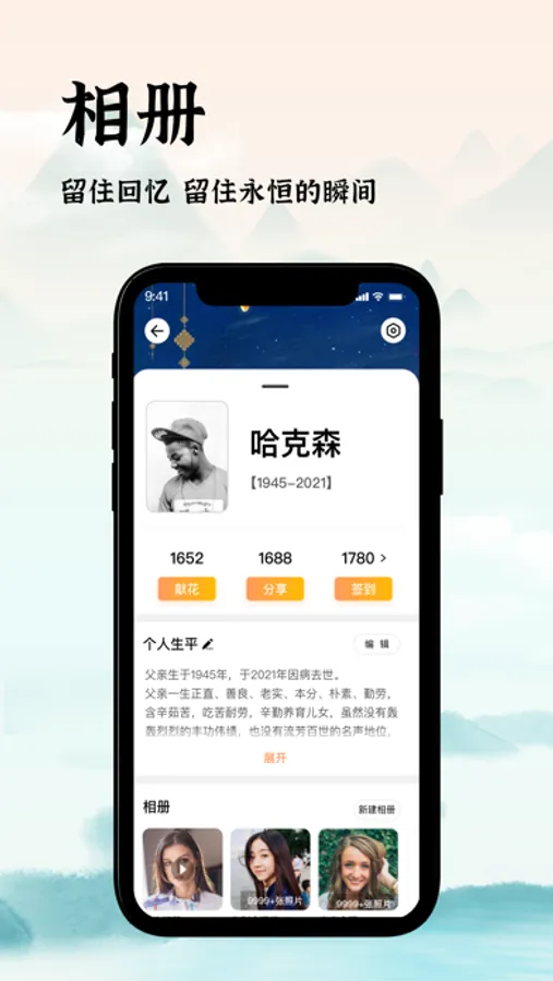 用户可访问认领、管理和浏览过的纪念堂,根据用户身份状态显示逝者纪念堂信息,包括:浏览纪念堂逝者头像、名称、生卒年、个人生平、权限范围内的相册数据等