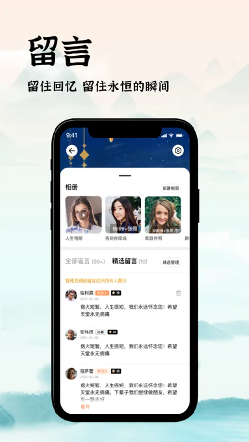 3.3.留言和精选留言:用户可对逝者进行留言怀念,访客用户留言仅自己可见,管理员可查看所有,并可删除用户留言;管理员可设置精选留言,所有用户均可见;