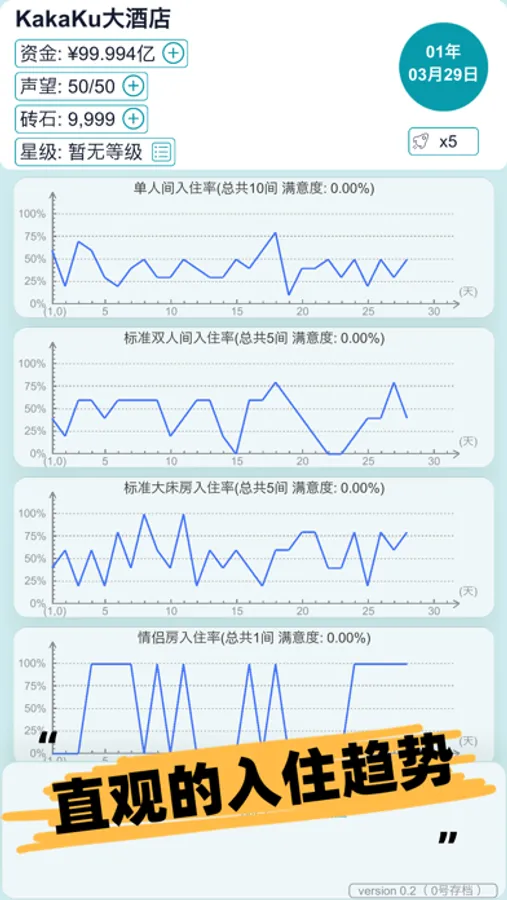 游戏内包含了直观而详细的酒店入住、经营报表,玩家需要根据经营报表去实时调整酒店经营策略!