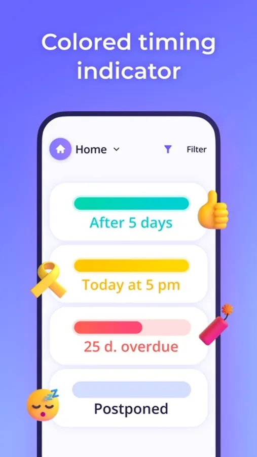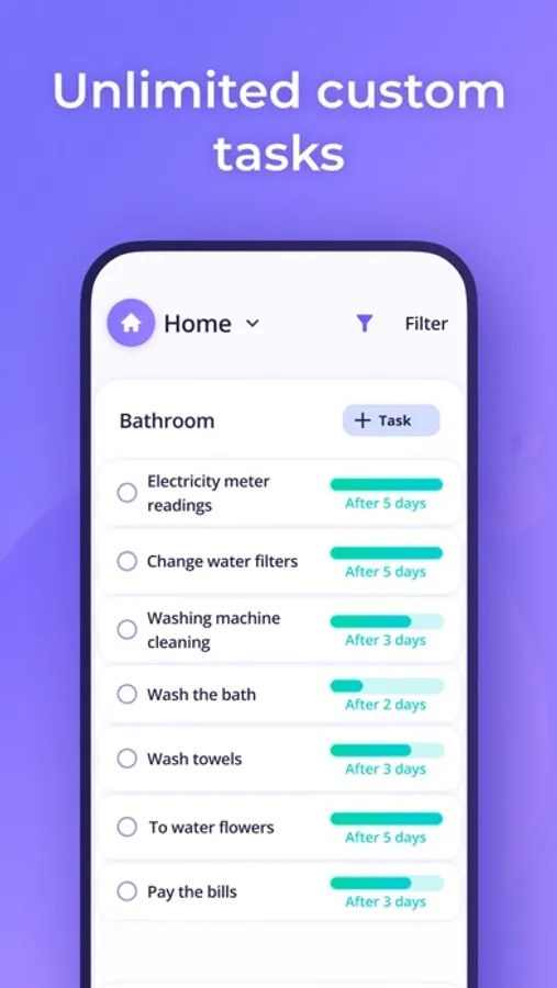 The frequency of cleaning is set when creating a task. After completing a task, you mark in the application that it is done. In the future, you do not need to calculate the terms and dates of chores around the house - you can easily see the list of tasks that it is time to complete by the color indicator: