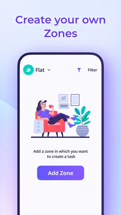 Add rooms or spaces that suit your home - Zones. You give the name for the zones yourself as it is convenient for you. The number of zones is unlimited. For each zone, you can add an unlimited number of tasks. After creating tasks, you can view them separately for each zone or in the general to-do list.