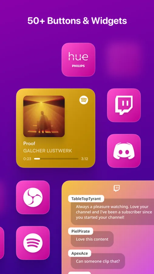 Trigger apps or shortcuts in your operating system, control music, lights, microphones, and cameras, and kickstart your stream with a single tap.