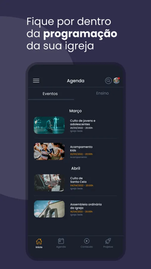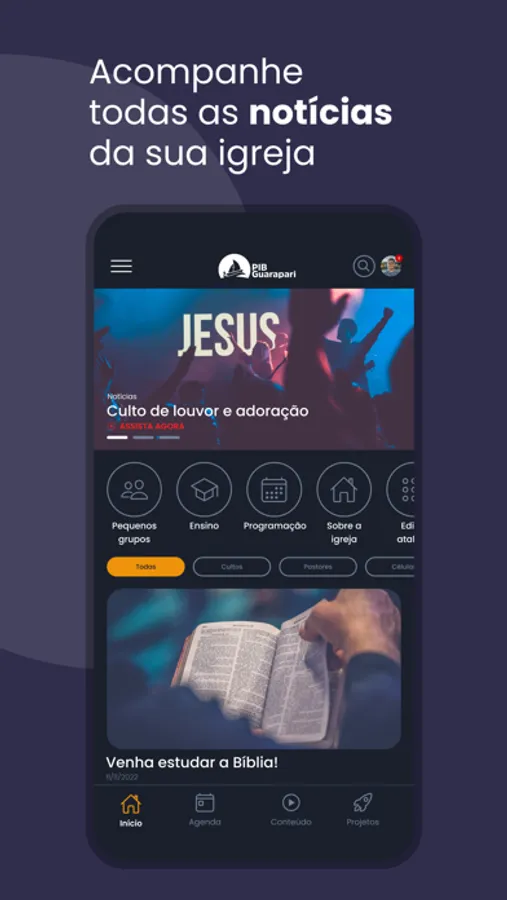 Recursos disponíveis no Aplicativo: Notícias, Agenda da igreja, Eventos, Conteúdos, Projetos, Transmissão ao Vivo e Módulo Ensino.