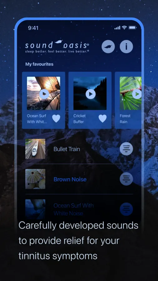 The sounds in this app can be an effective tool to manage your tinnitus using sound therapy and sound masking to make tinnitus symptoms less noticeable. This masking effect can be particularly effective at night when the surrounding environment is quieter. By listening to pleasant sounds, particularly sounds close to the frequency level of your tinnitus symptoms, your brain will predominantly hear the pleasant sound instead of the annoying tinnitus noise.
