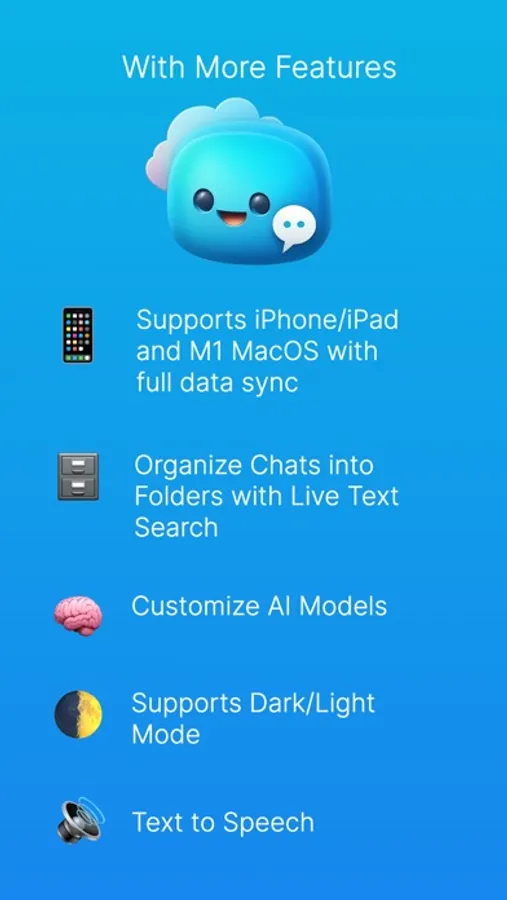 Our iPhone app is your personal assistant powered by a powerful AI. With this AI, you can easily plan trips, learn new languages, get help with your coding or school work or ask the AI to generate images for you. Plus, all your chats are seamlessly synced between your iPhone, iPad, and MacOS - no login required.