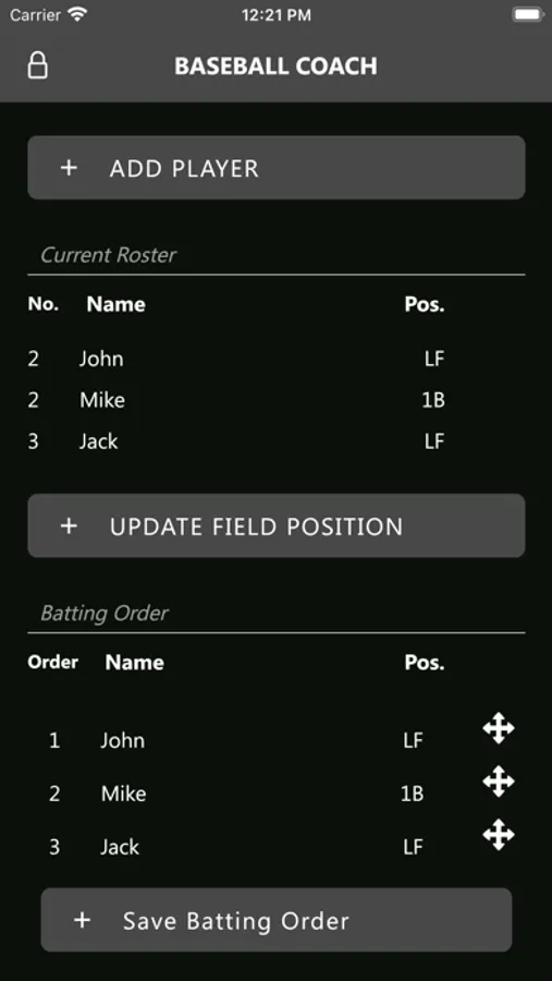 Looking to setup your baseball team? use our app to add players, set batting order and place players field positions.