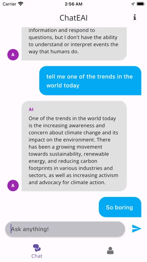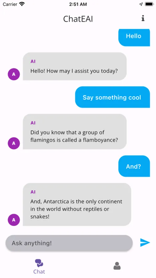 Conversations in this app are not saved in the database, so you can ask questions that you don't want anyone to find out!