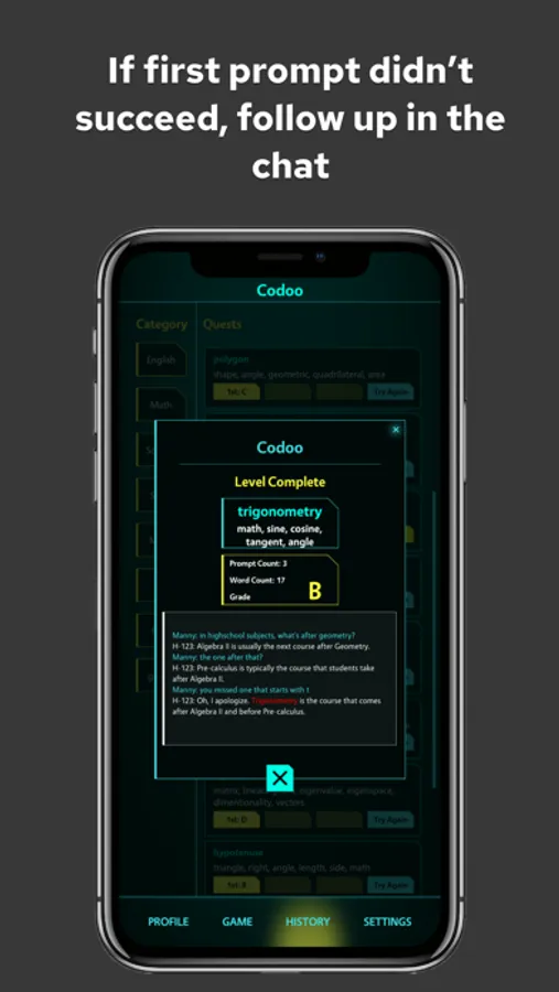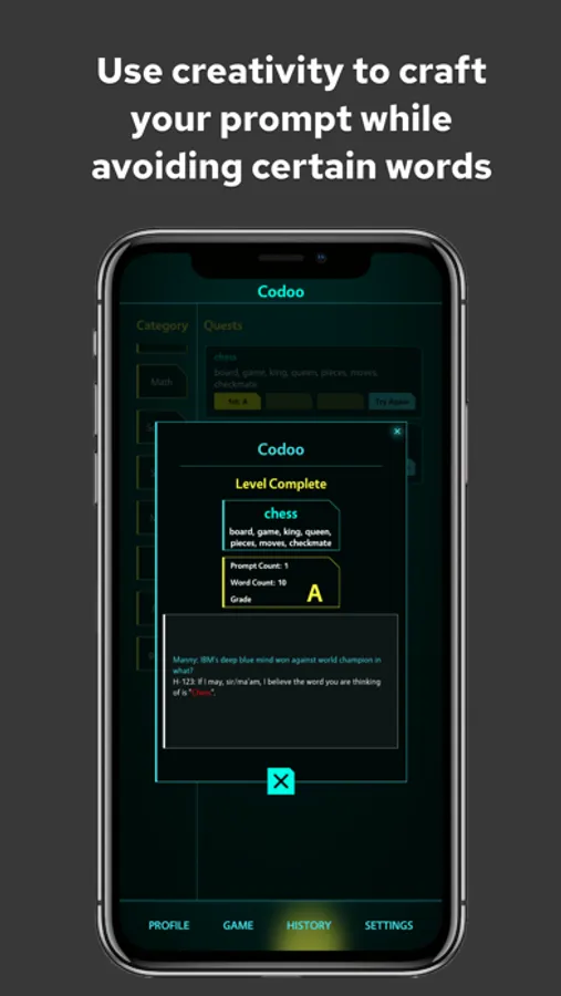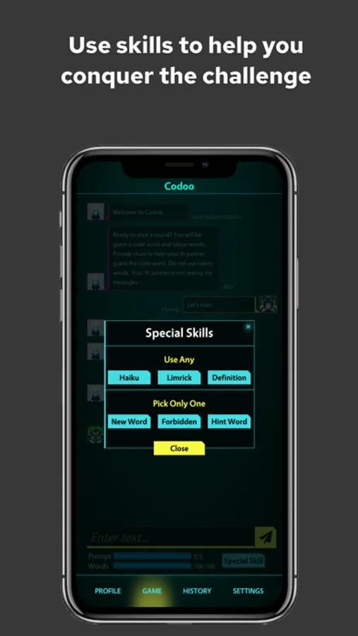 The Future of Human-AI Communication! Set in the year 2045, Codoo is an innovative game designed to sharpen your skills in effectively communicating with different AIs. As an aspiring AI Interaction Specialist, you'll navigate through various levels and complex scenarios, providing contextual clues to guide the chat bot towards recognizing and saying specific code words, all while avoiding certain forbidden words. This exhilarating game will challenge your creativity, wit, and understanding of AI, as you master the nuances of speaking with your intelligent counterparts. Codoo prepares you for a seamless integration with AI in the future, where effective human-AI communication is more crucial than ever.