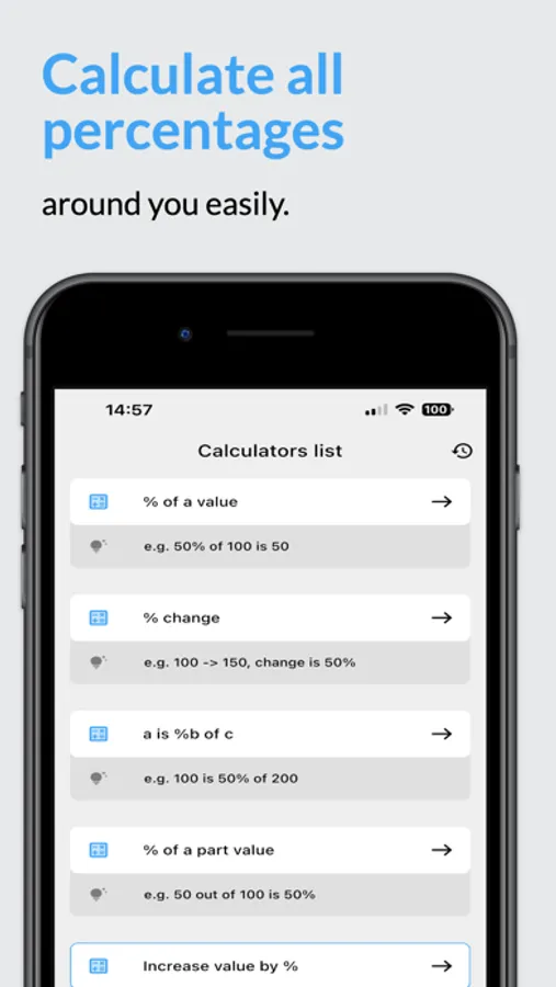 The Percentage Calculator is an all-in-one iOS app designed to make percentage calculations easier and quicker. Whether you're a student, teacher, businessman, or anyone who deals with numbers, this app will save you time and energy by providing quick solutions to your percentage problems.