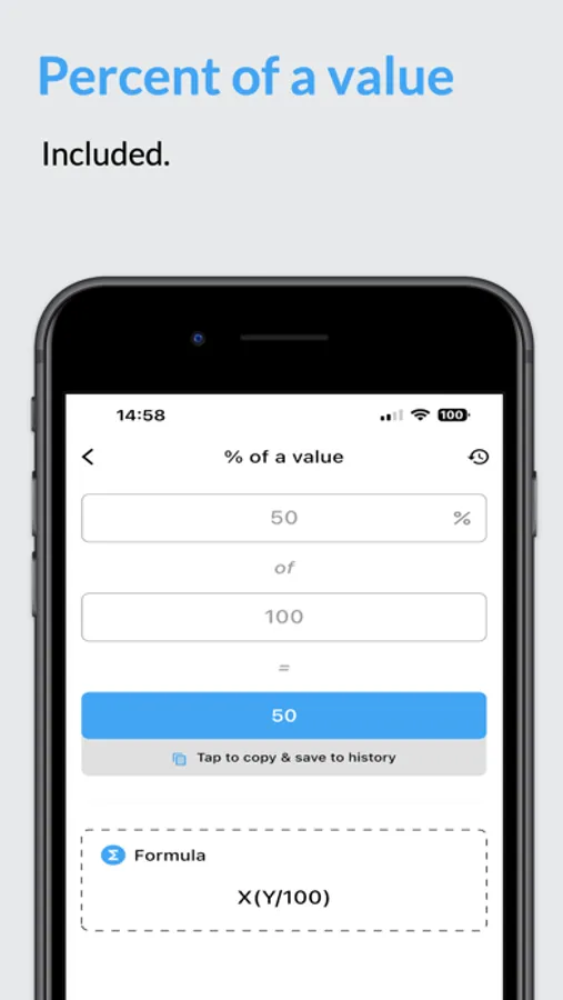 1. Percentage of a concrete number: This calculator helps you find the percentage of a number. Simply enter the number and the percentage, and the app will instantly calculate the result.
