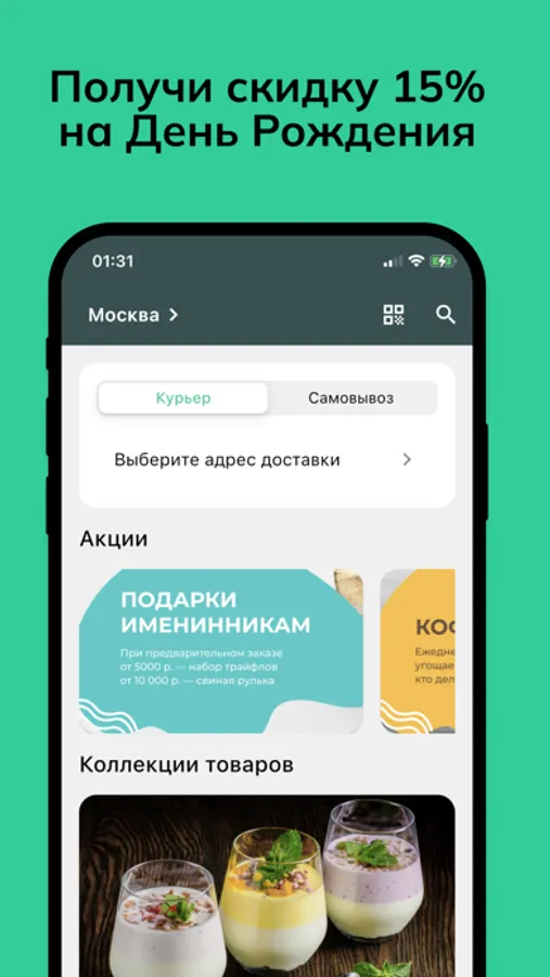 В приложении вы можете выбрать доставку, самовывоз и заказ в заведении.