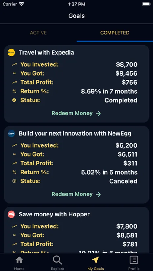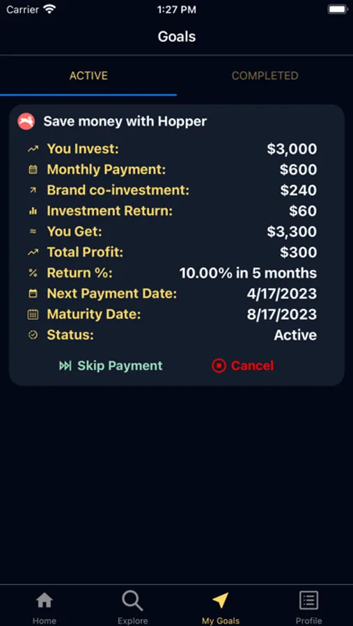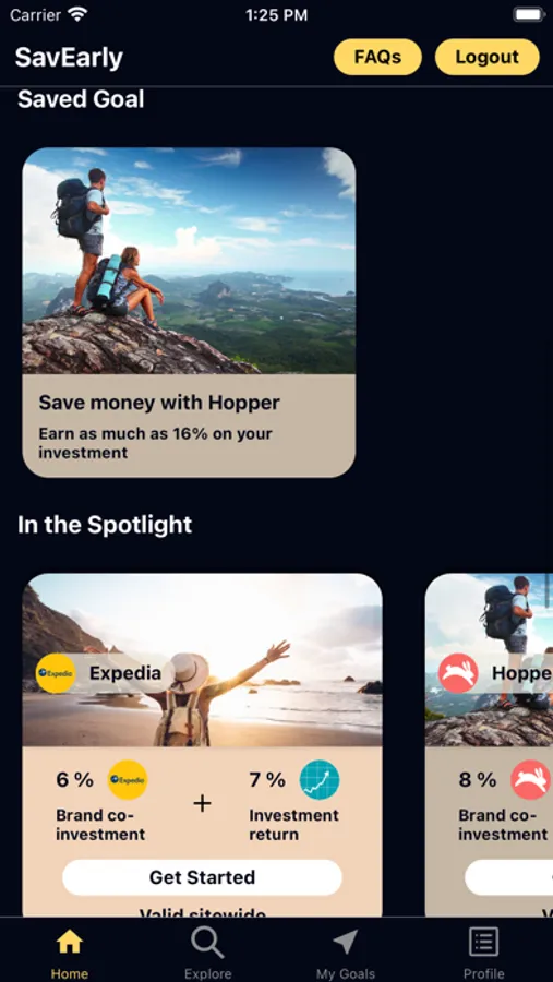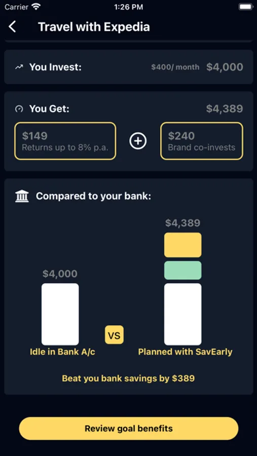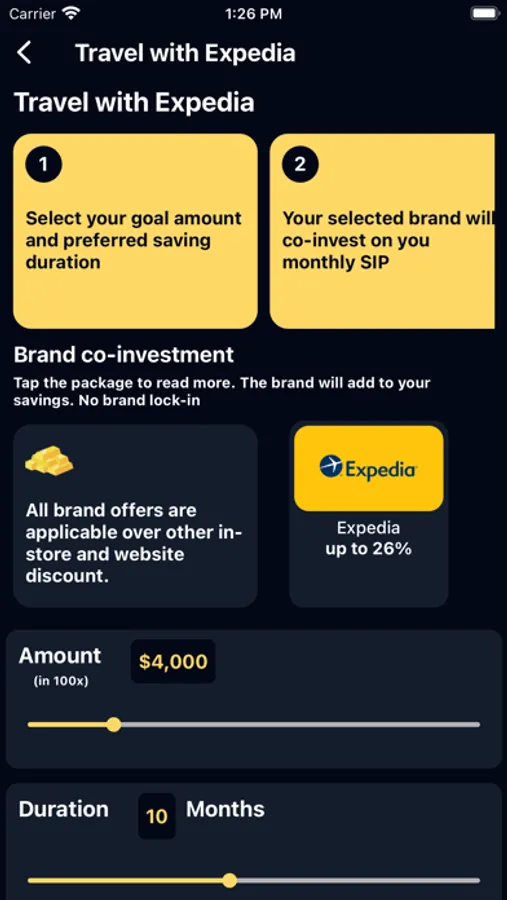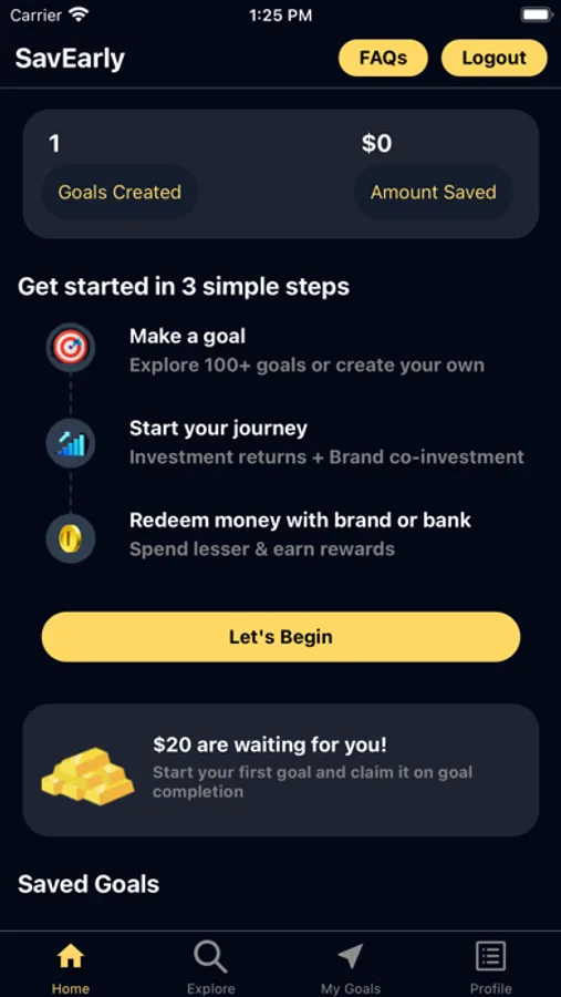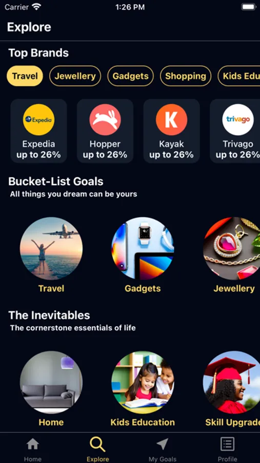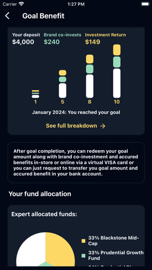 Our app offers multiple goals for a variety of different categories like travel, jewelry, electronics, home improvement, kid's education, etc. to choose from. Every goal is associated with a brand that contributes to the customer's goal every time customers contribute to their goal. Customer payment goes to our FDIC-approved partnered bank account. At the end of the goal, the customer can make an in-store or online purchase with the brand using a virtual debit/gift card or can request a transfer to their bank account. In the latter, the customer will not receive the brand discount advantage.