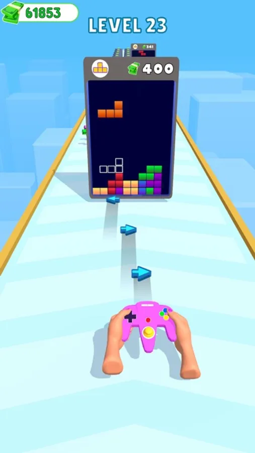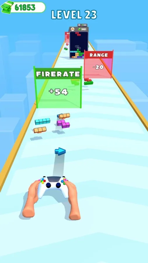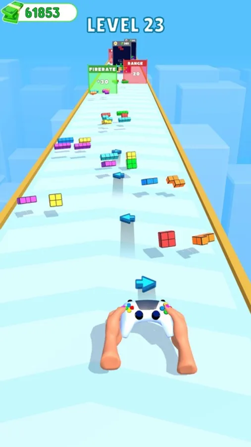 You have a broken controller!! You can complete the controller by collecting the blocks. The controller shoots arrow keys by clicking the buttons rapidly. Choose the gates wisely to upgrade your firepower, and aim for the puzzle screens to complete your block puzzle.