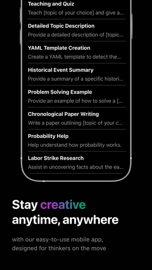 Our app is easy to use and intuitive, with a user-friendly interface that makes finding the right prompt a breeze. Simply select the category that best fits your query, and you'll be presented with a list of prompts to choose from.