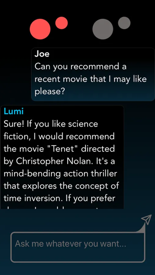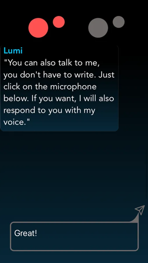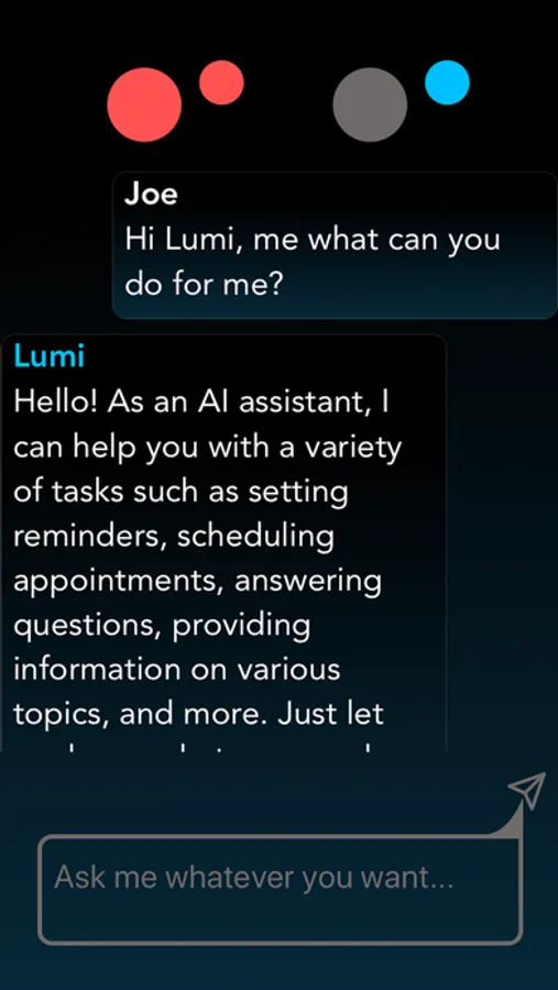 Two eyes and one mouth: the graphics of LUMI are all here, linear and simple. Few keys, few clicks: LUMI has an intuitive interface. Touch the eyes, the mouth, and the send icon and you're done. But behind LUMI, there's ChatGPT, the most powerful and advanced AI technology.
