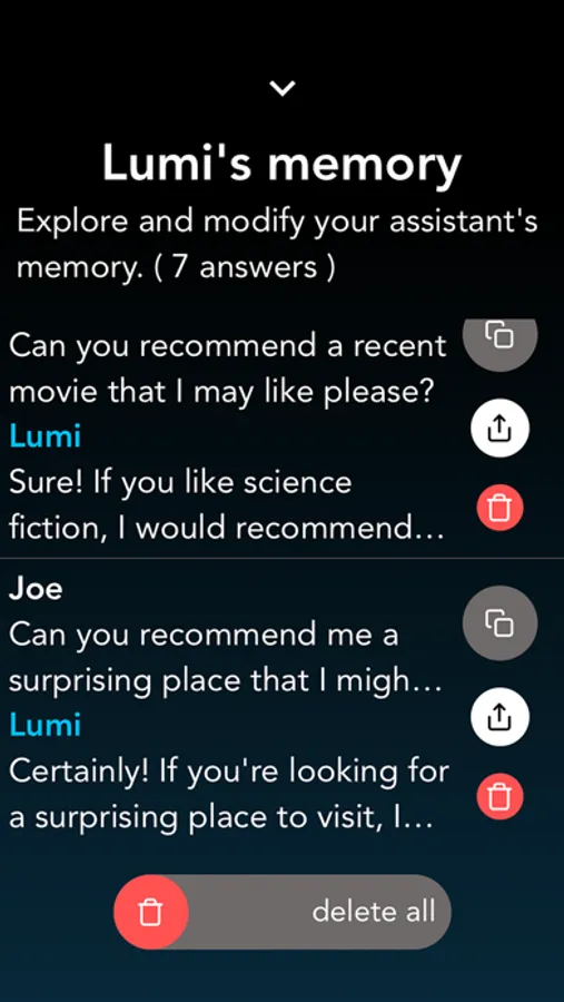 You can keep your conversations with LUMI or delete them. You can also copy them and send them to whoever you want.