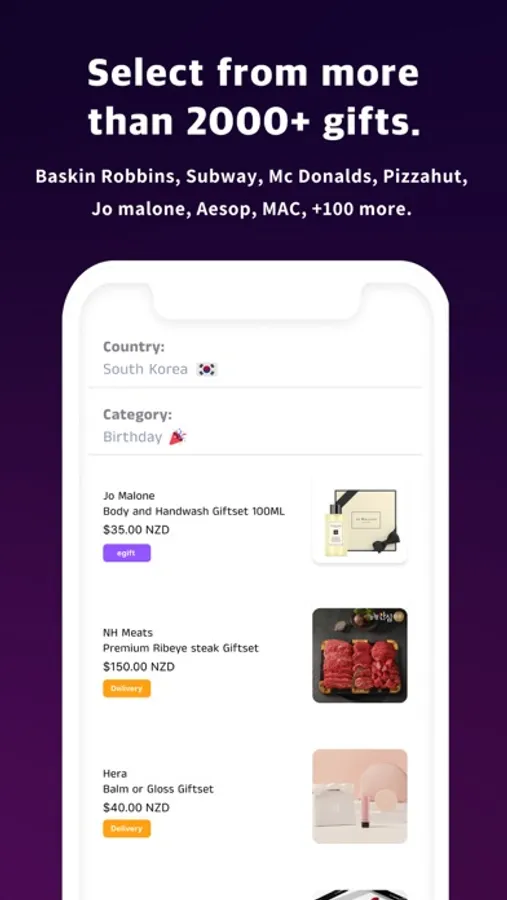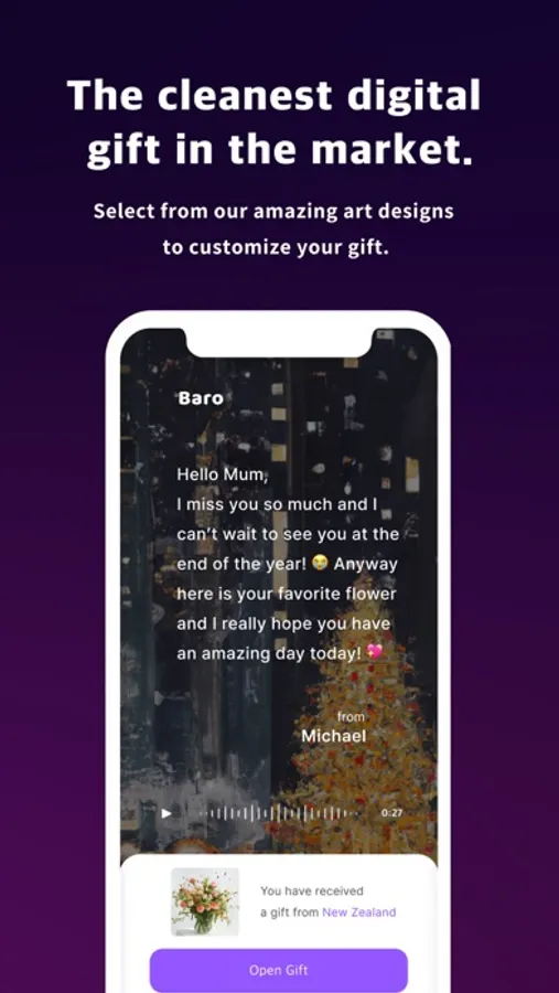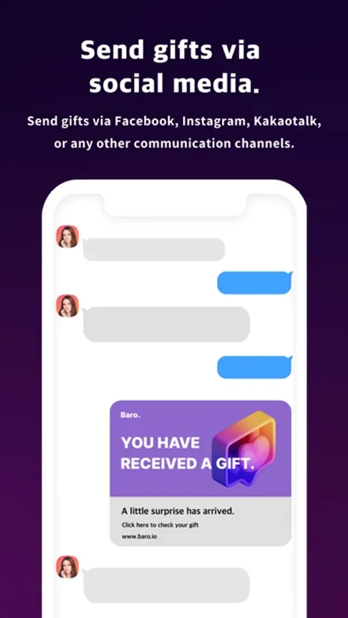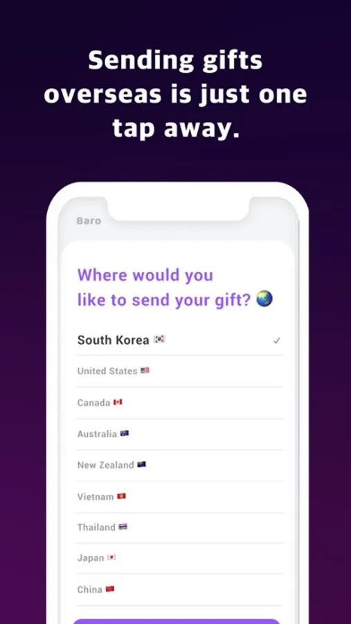Whether you're sending a gift to your grandma in another country or to a friend studying abroad, Baro makes it simple and convenient. With the ability to send gifts from 140 countries, you can surprise someone from anywhere, anytime. Simply select a gift, add a personal message, and let Baro handle the delivery.