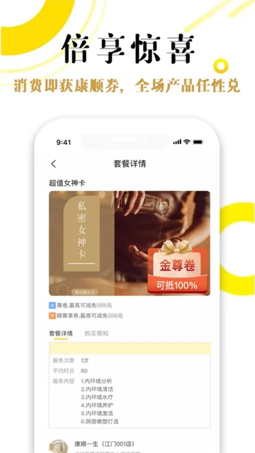 多种渠道收获康顺券,全场服务于与产品任性兑换。获得途径包括商城消费、互动、分享,以及线下门店消费等。