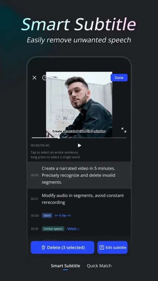 Smart Subtitle: Automatically eliminate irrelevant, quiet, and repetitive speech while adjusting audio without reshooting.