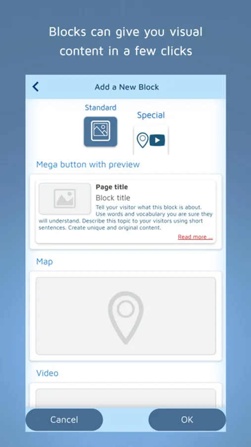 • Add your logo, photos, a gallery, videos, maps, and more.