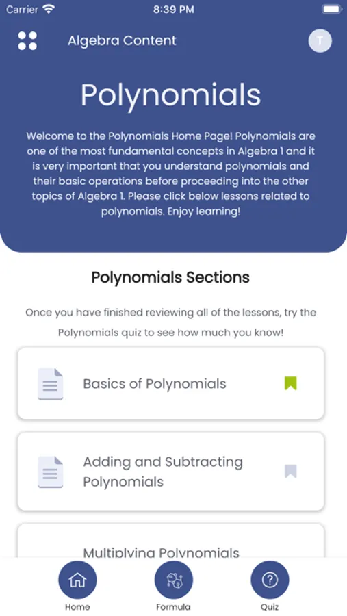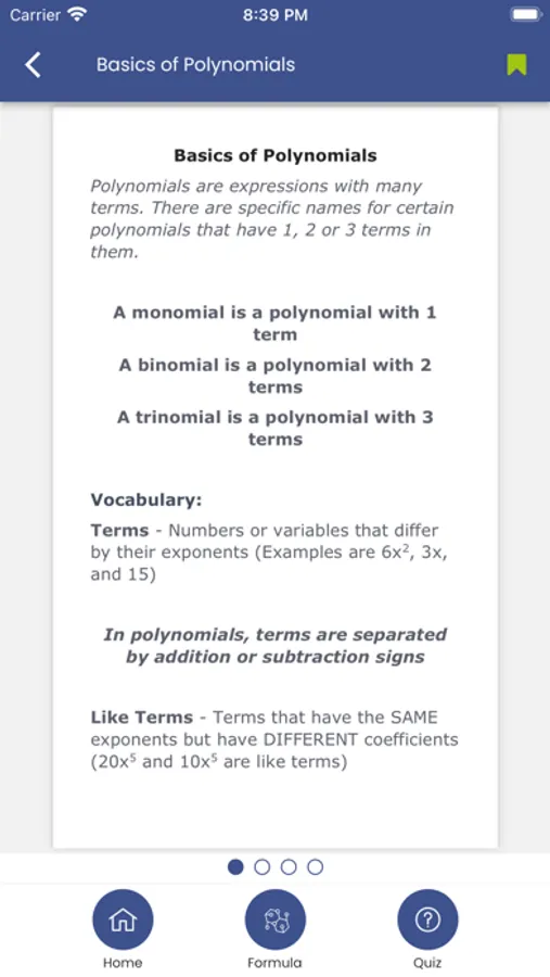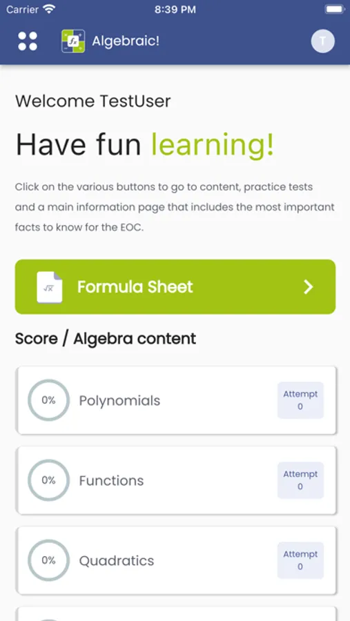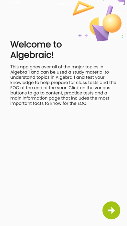 This app goes over all of the major topics in Algebra 1 and can be used a study material to understand topics in Algebra 1 and test your knowledge to help prepare for class tests and the EOC at the end of the year.