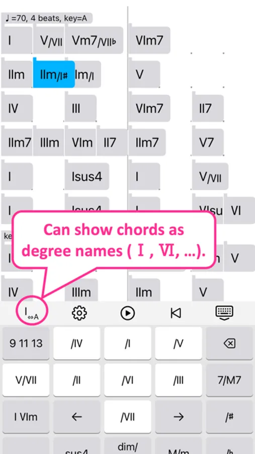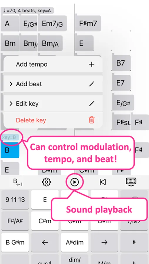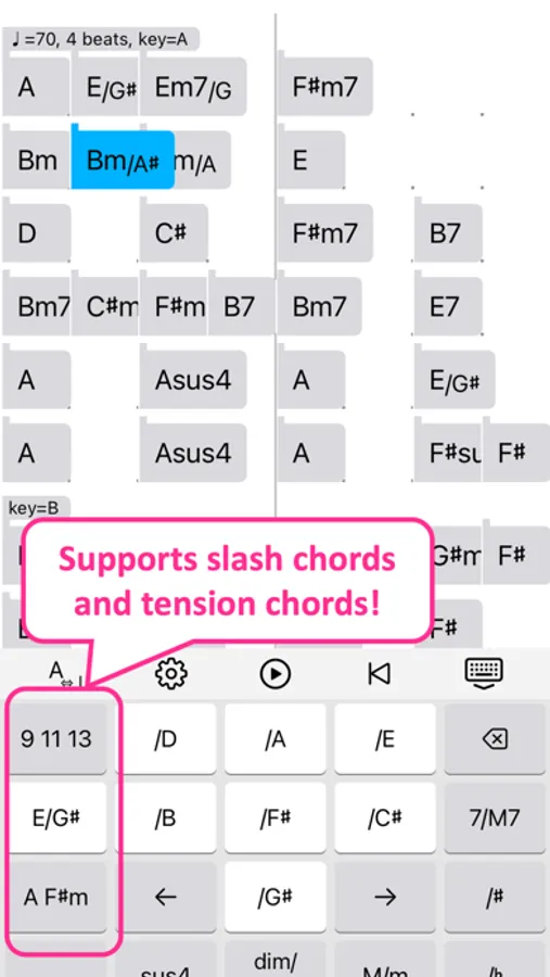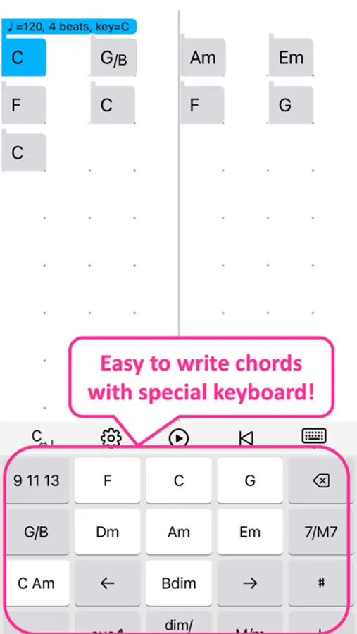 - Enter chords with the dedicated keyboard (including slash and tension chords)