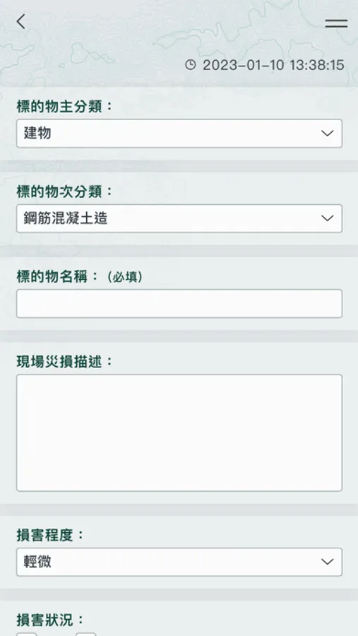 新增調查表:在進行災害調查時,調查員可以記錄目前現場的詳細資訊,並上傳有關的照片、影片和精確的地理定位座標。