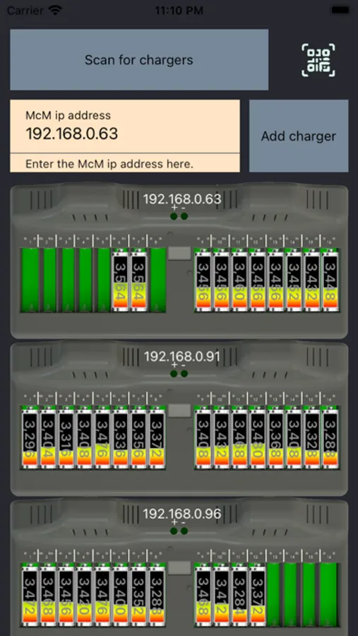 Multiple cell chargers can be listed in a single view with near real time data updates. Grid cells flash for elements being updated and the actual status of the cells are shown in the various columns.