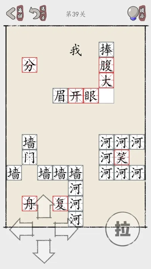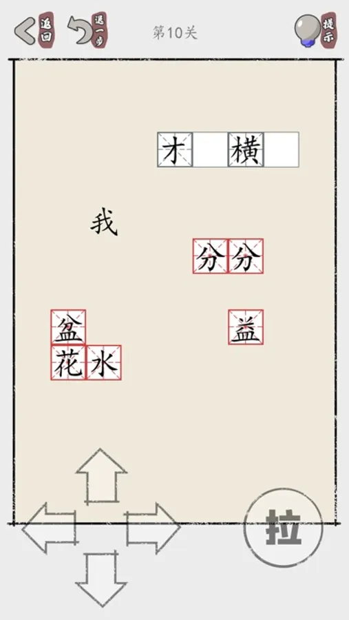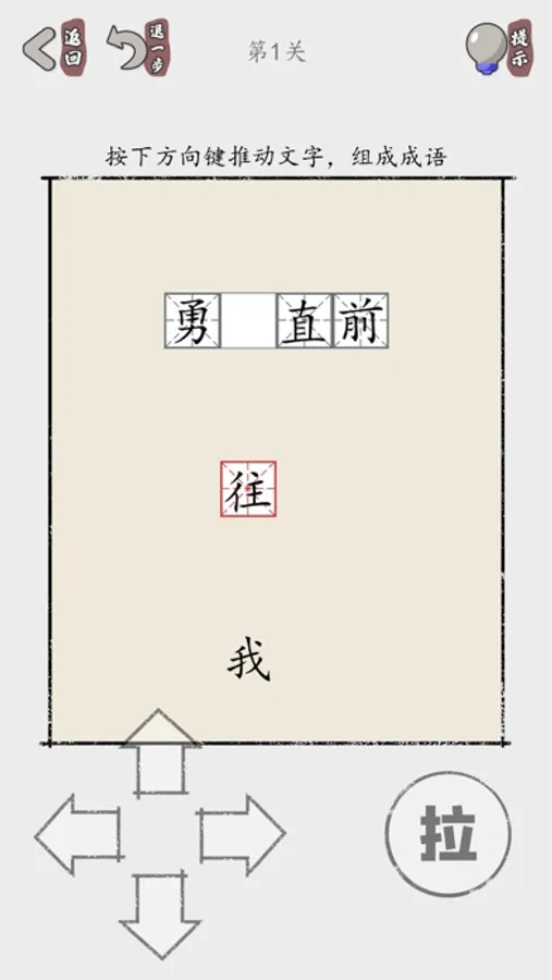 这是一款组合文字拼成成语的益智游戏,游戏中需要我们移动人物推动文字,将它们组合或拆分成另一个文字,然后把它们组合成成语,游戏看似简单但需要巧妙的运用文字的含义才能顺序通关,快来挑战一下吧。
