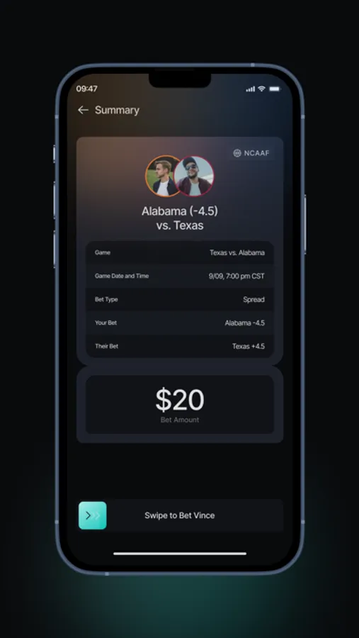 Create a wager: enter the amount you want to bet and ‘swipe right’ to propose the bet directly to your opponent. They’ll receive the bet instantly to then accept or reject it.