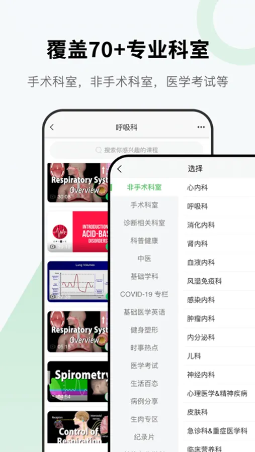 【覆盖70多专业科室】医课平台内容包括,手术科室、非手术科室、诊断相关科室、基础学科、中医、基础医学英语、医学考试、USMLE、RN、科研SCI等,满足不同专业学员的学习需求。