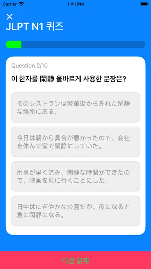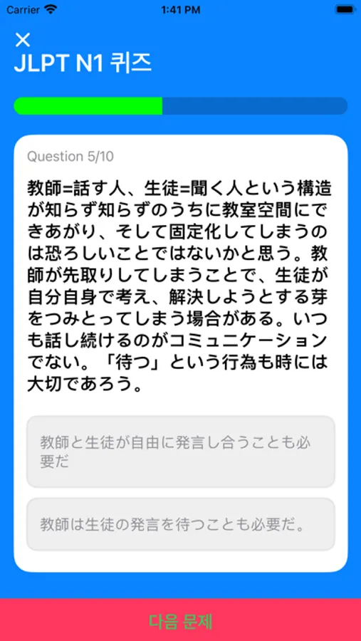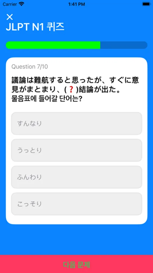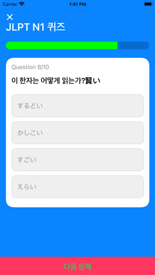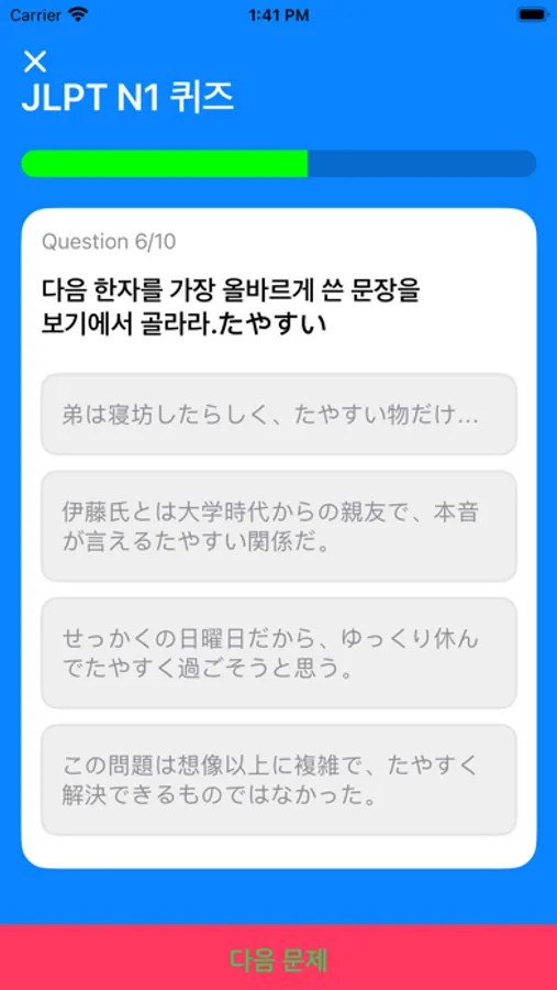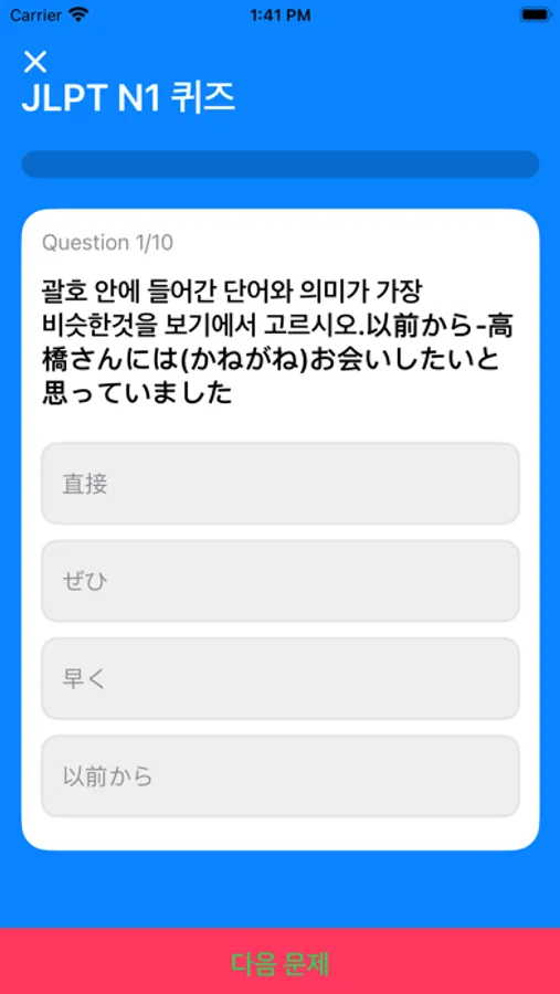 일본어 능력평가 시험 JLPT N1을 준비하는 수험생이 시험치러 가기전에 자신의 실력을 간단하게 확인하고 체크해볼수 퀴즈어플입니다.