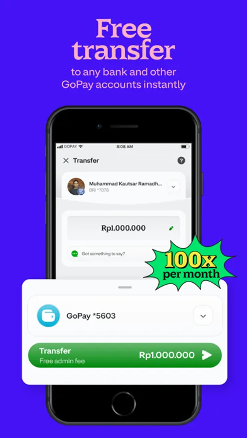 - Send money to any banks, including BCA, BNI, BRI, BSI, CIMB, Jago, Mandiri, Permata, and other e-wallets (Dana, OVO, ShopeePay)