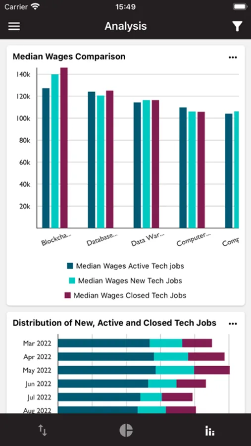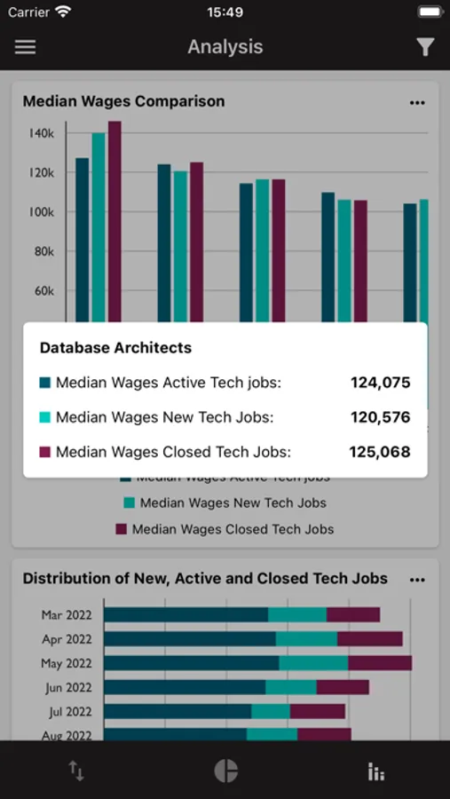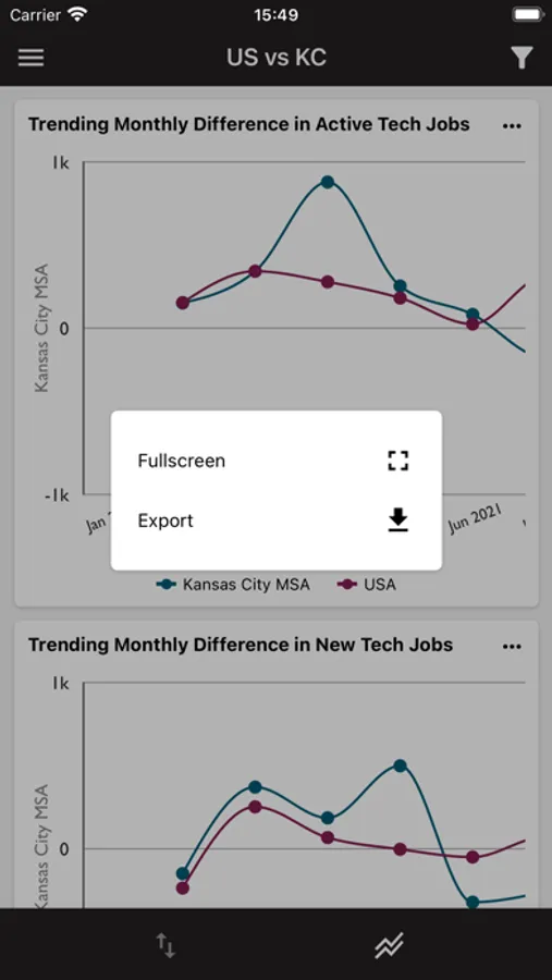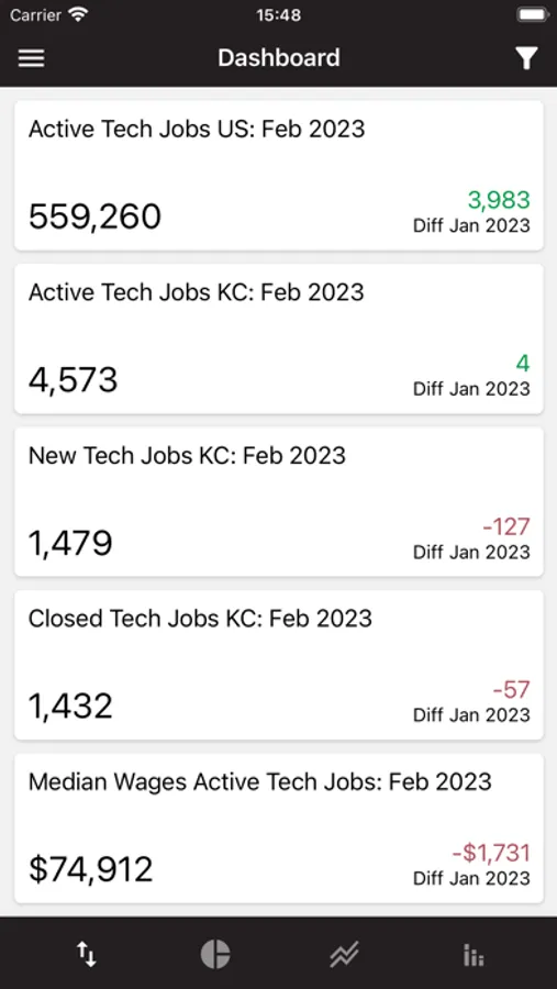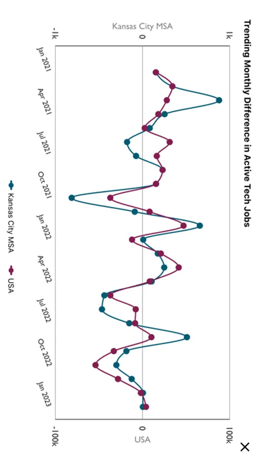 • Browse Kansas City tech trend graphs featuring job listings and median wages by month