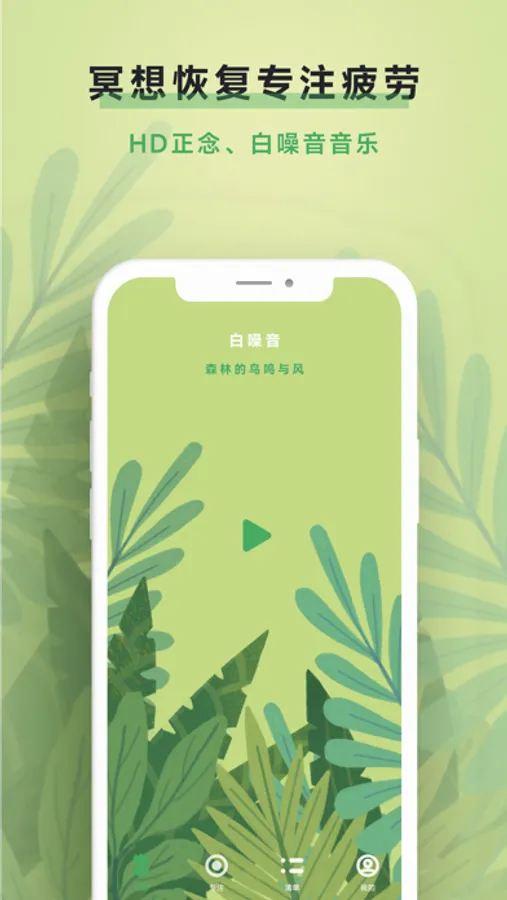 - 白噪音:支持美好的自然音乐、轻冥想音乐,同时也可以使用手机中的其他音乐APP作为背景音;