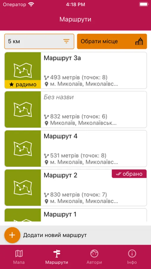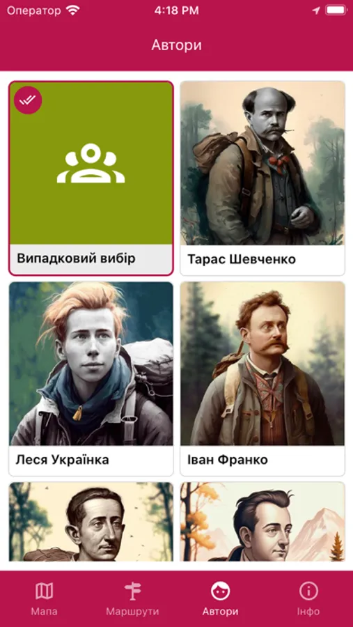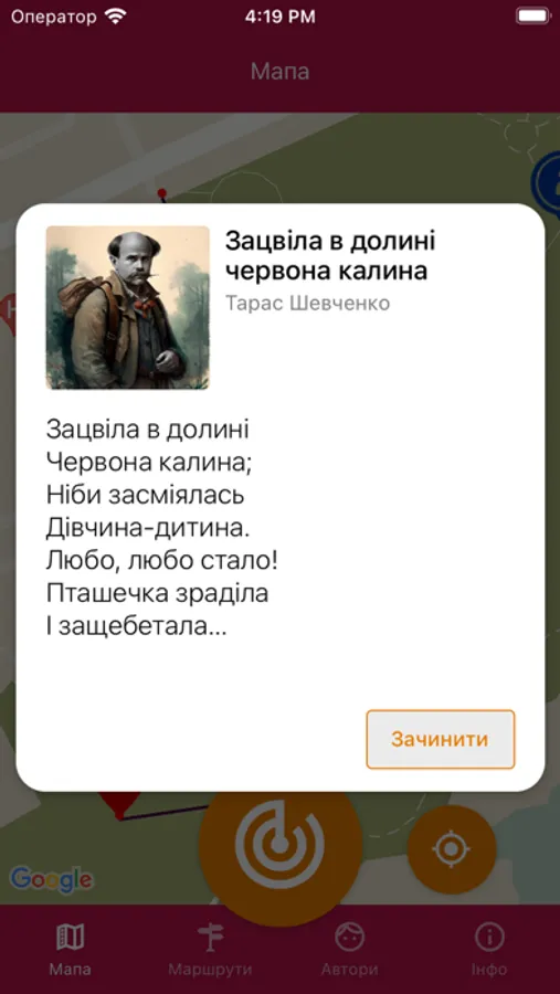 Під час досягнення кожної точки на карті маршруту відкривається невеликий фрагмент вірша. Для нашого застосунку ми обрали поезію відомих українських поетів: Тараса Шевченка, Лесі Українки та багатьох інших.