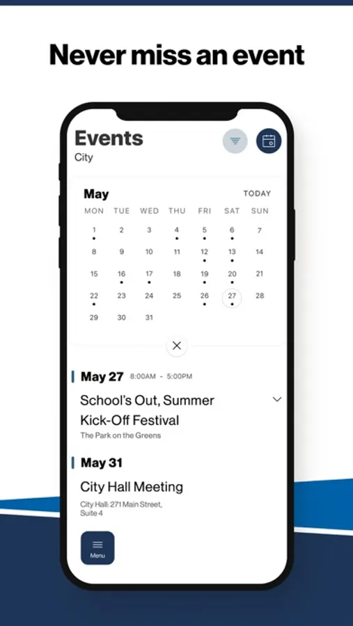 The event section shows a list of events throughout our community. Easily add an event to your own calendar and/or share the event with friends and family with one tap.
