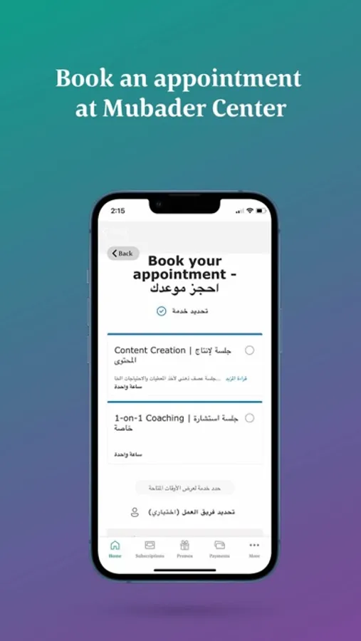 3. Through the app there is a scheduling system that allows you to book any of the facilities or services offered by Mubader Centre. The Centre includes facilities like meeting rooms, a media room and a business lounge. And services include one-on-one coaching, content creation services and much more.