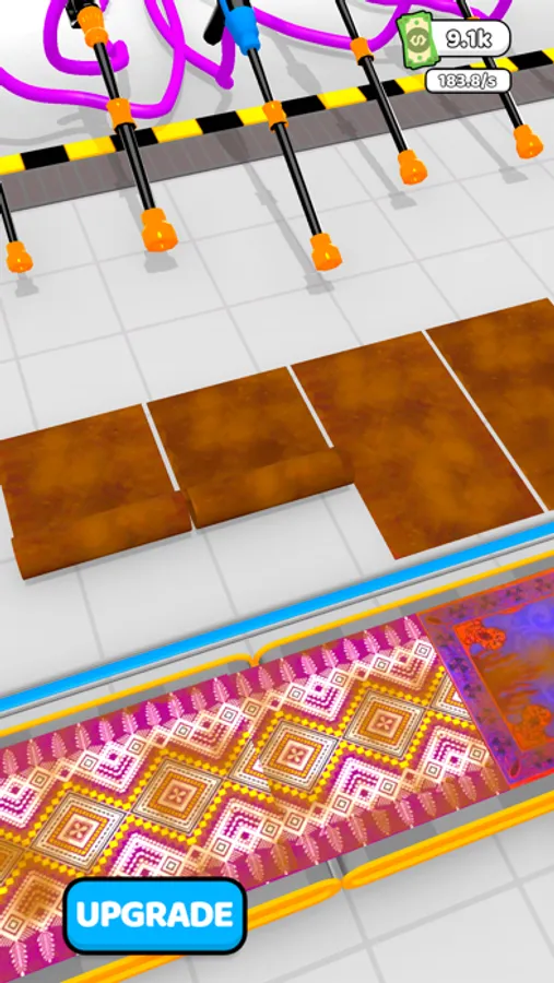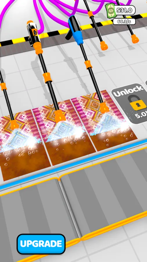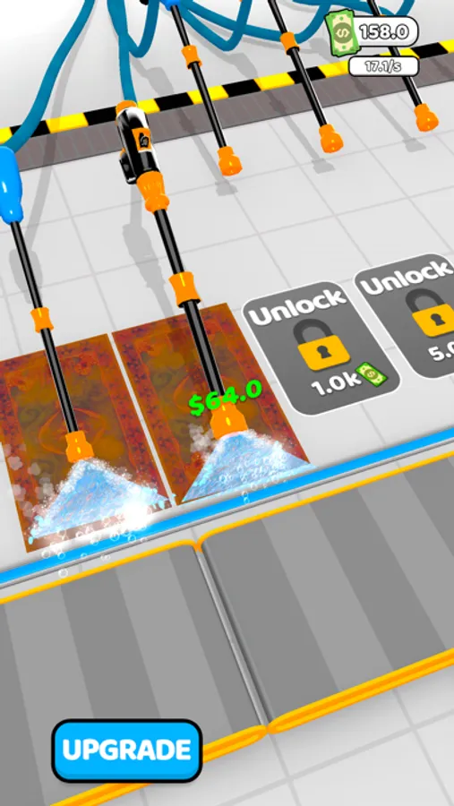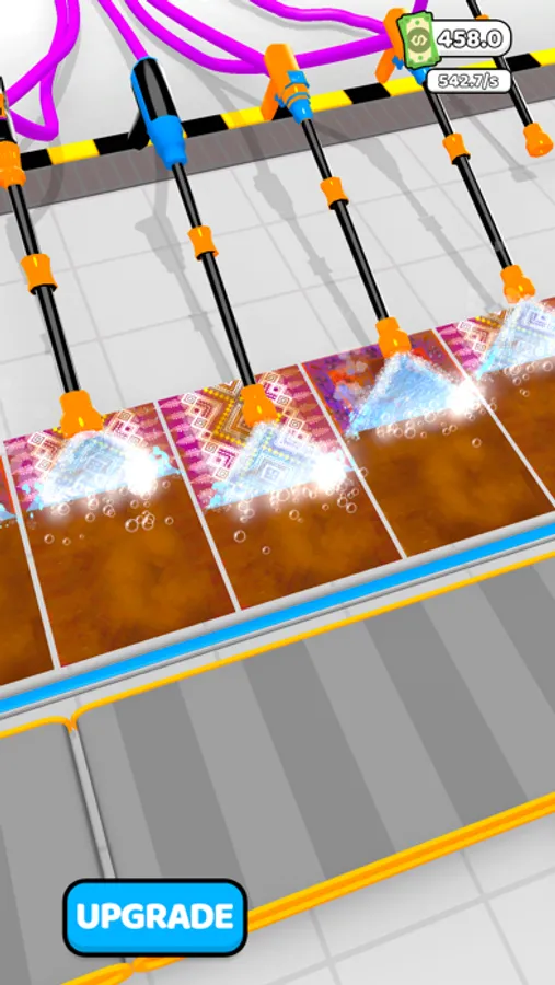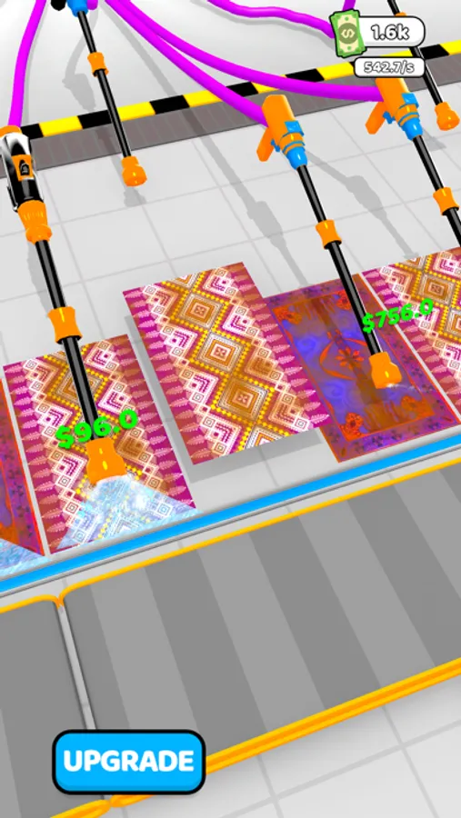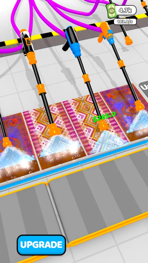 Welcome to the carpet washing factory. You will clean the carpets using pressure washing machines. Purchase soaps and connect them to machines to clean faster and earn more money. Unlock more machines and clean more carpets. Time to start!