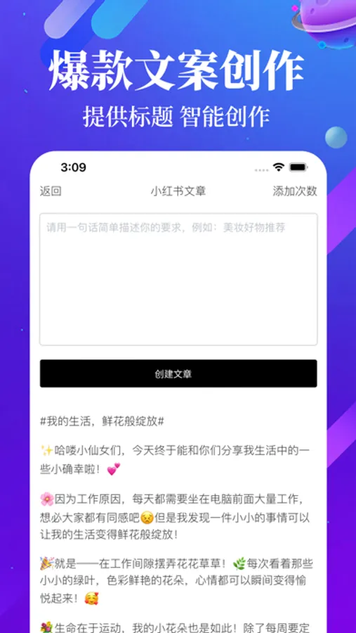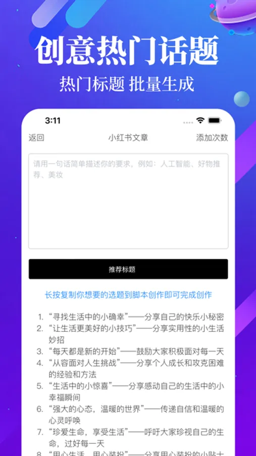 3、本地保存与历史记录:生成的数据将直接保存在手机本地,您可以随时在应用内查看和编辑历史记录。这样,您可以轻松管理自己的创意想法,随时调整和优化内容。