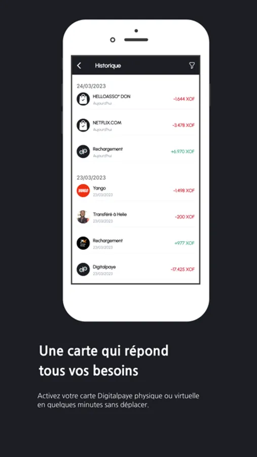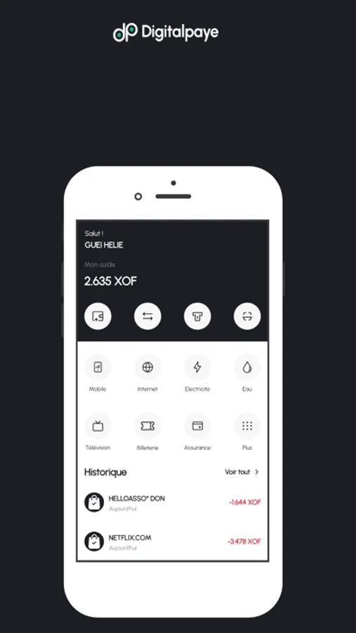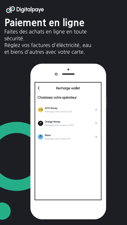 Téléchargez l'application Digitalpaye et activer votre carte physique ou virtuelle Digitalpaye VISA pour les paiements en ligne, transférer de l'argent de votre carte à un compte mobile money, de votre carte à un compte bancaire et payez instantanément dans les magasins et sur des sites/applications en ligne. Utilisez Digitalpaye pour les recharges mobile, la recharge DTH, les billets de cinéma, le paiement de factures post-payées, les factures de services publics telles que le paiement de factures d'eau, de gaz et d'électricité, ainsi que les paiements de téléphonie fixe, haut débit et d'assurance. Faites une réservation de train IRCTC, réservez des vols et des bus en quelques clics.