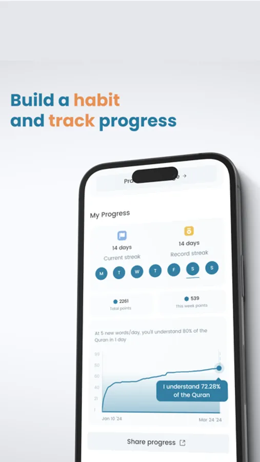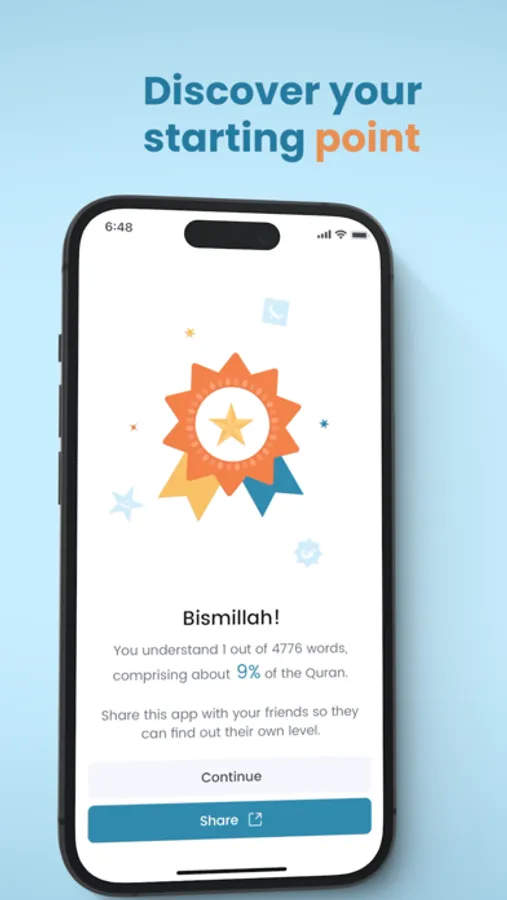 Start off with an on-boarding test and receive insights into your current understanding level, paving the way for a tailored learning journey. Kalaam will tell you exactly what percentage of the Quran you currently understand.