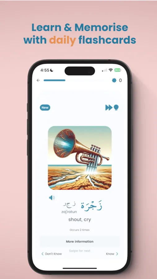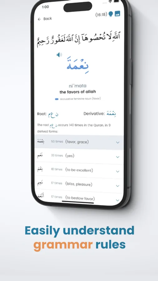 Every single day, come in for a daily lesson that will teach you new words with their Quranic context. Beautiful images showcase their range of meanings. Delve deeper to explore their usage throughout the Quran.